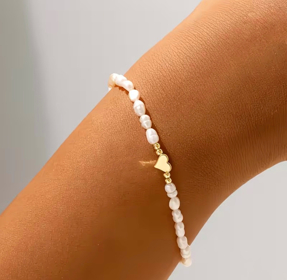 Perličkový náramek pro nevěstu se zlatým srdíčkem z umělých perel. Jedná se o bižuterii.